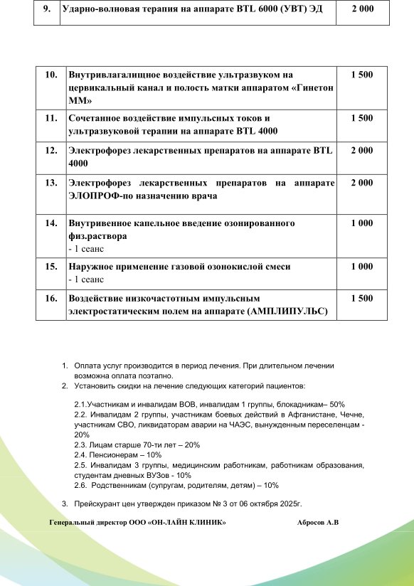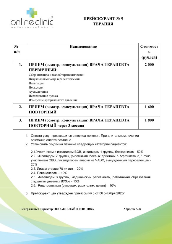 Прейскурант №9 "Терапия":