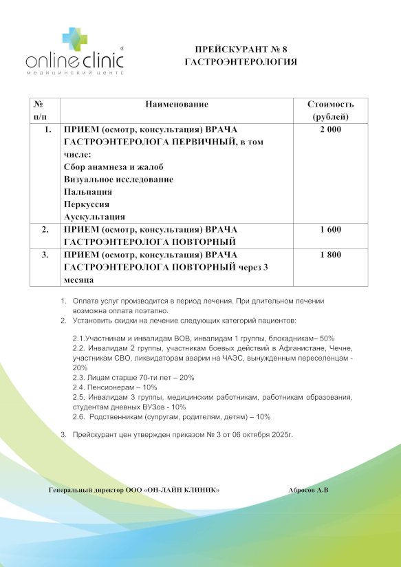 Прейскурант №8 "Гастроэнтерология":