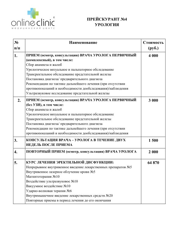 Прейскурант №4 "Урология":
